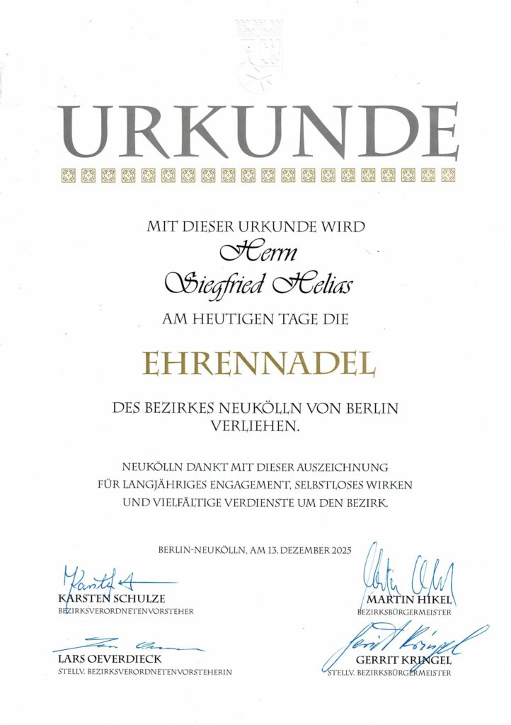 Am 13. Dezember 2025 wurde Siegfried Helias die Ehrennadel des Bezirks Neukölln verliehen.